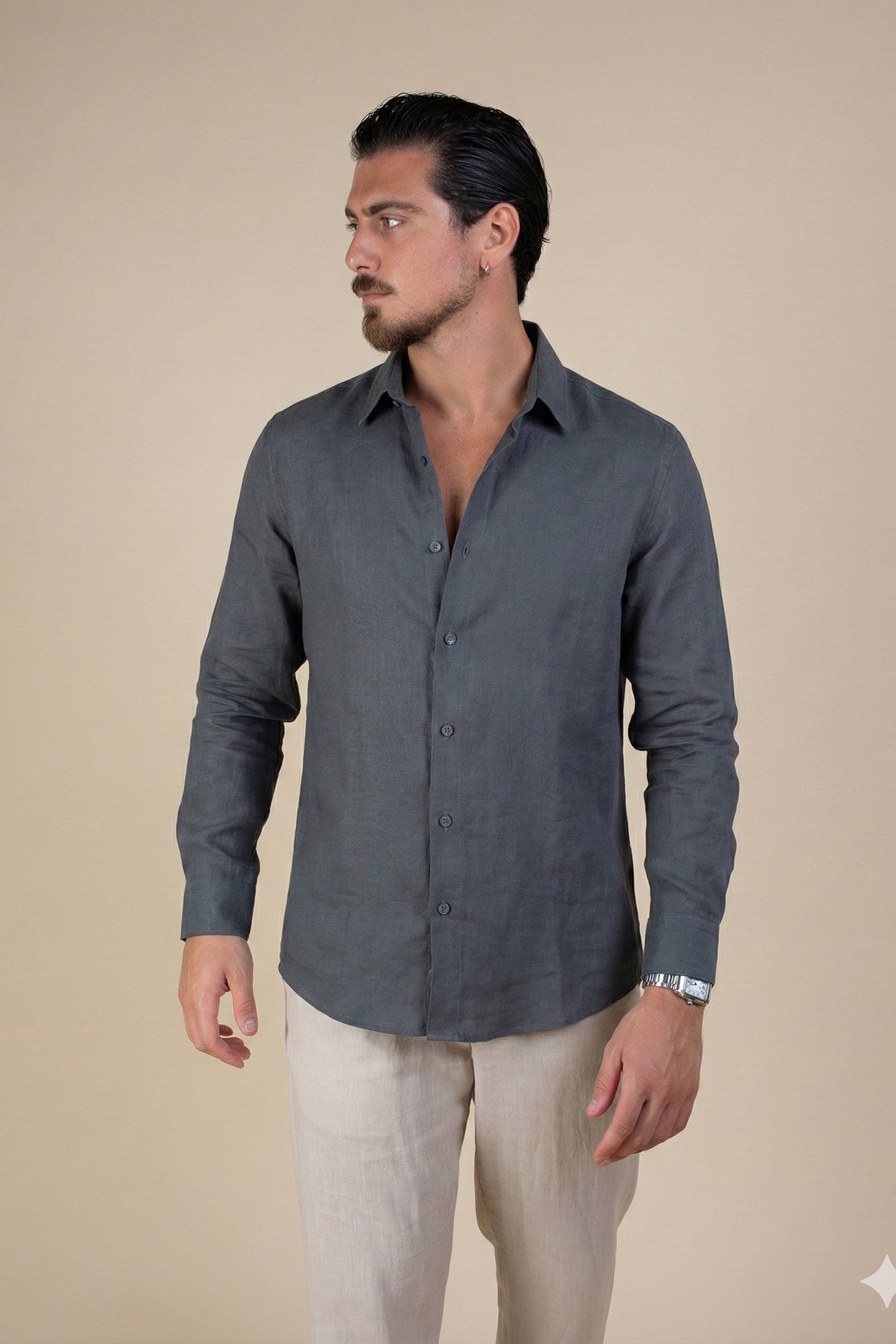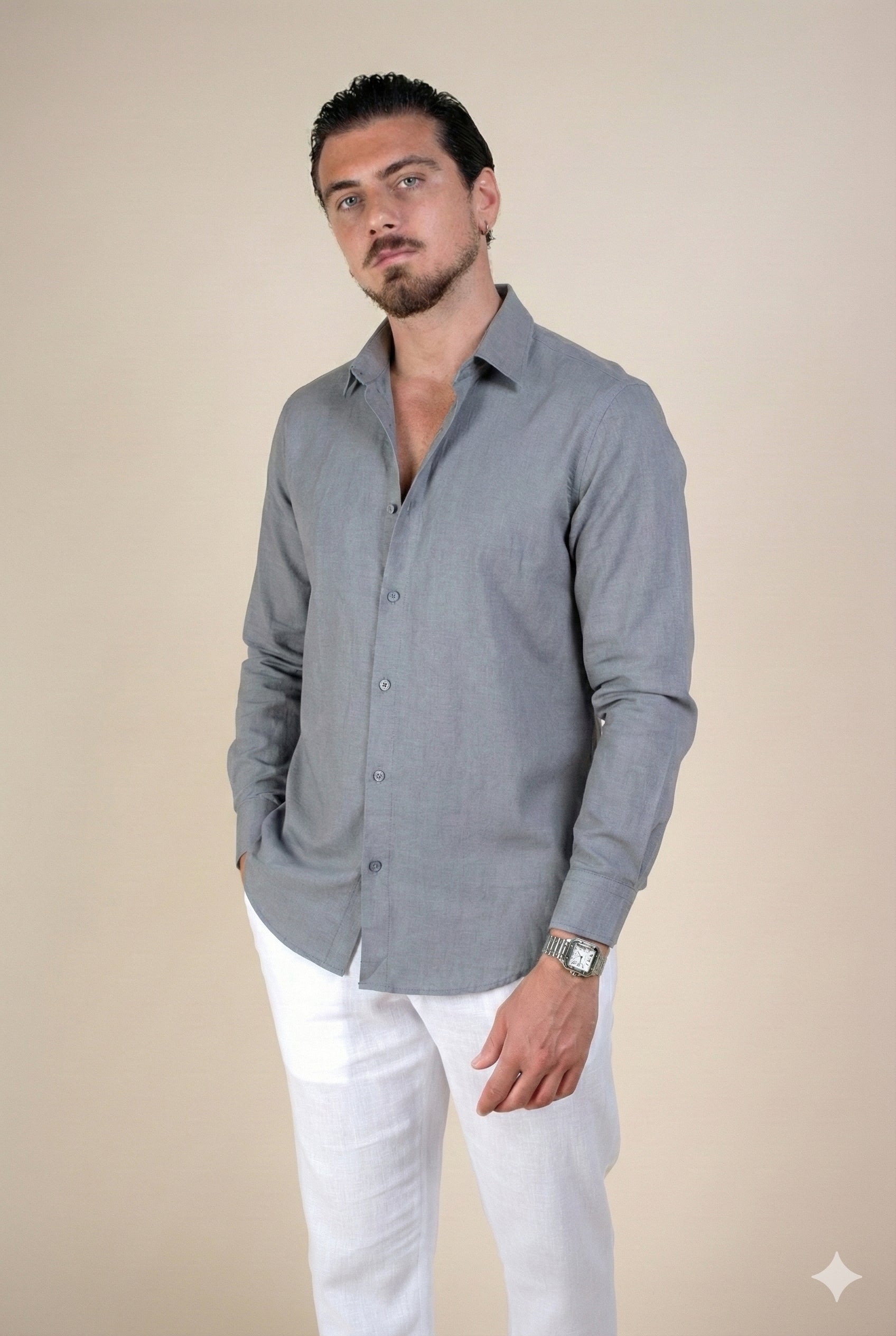חולצה פשתן מכופתרת סלים אפור בהיר