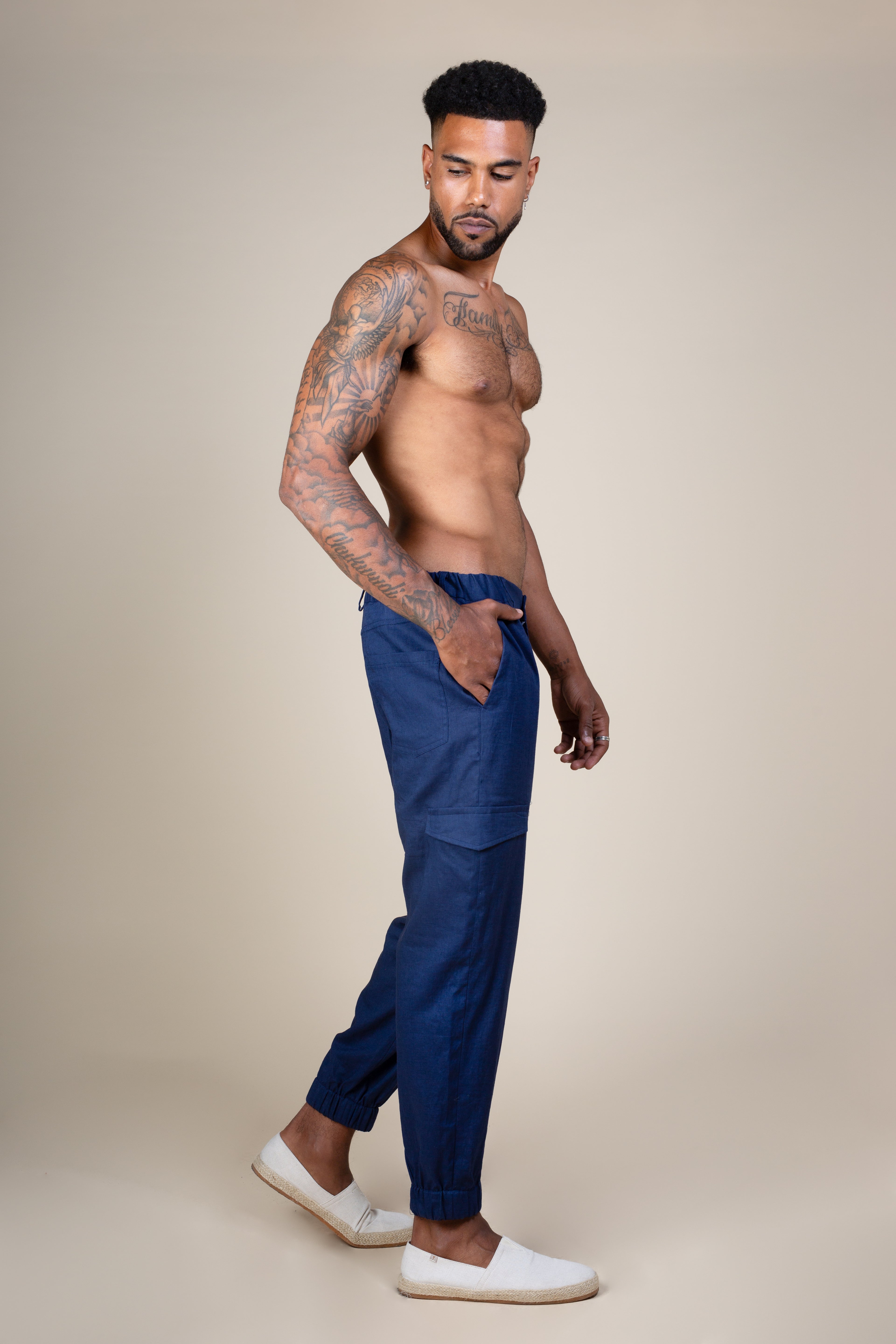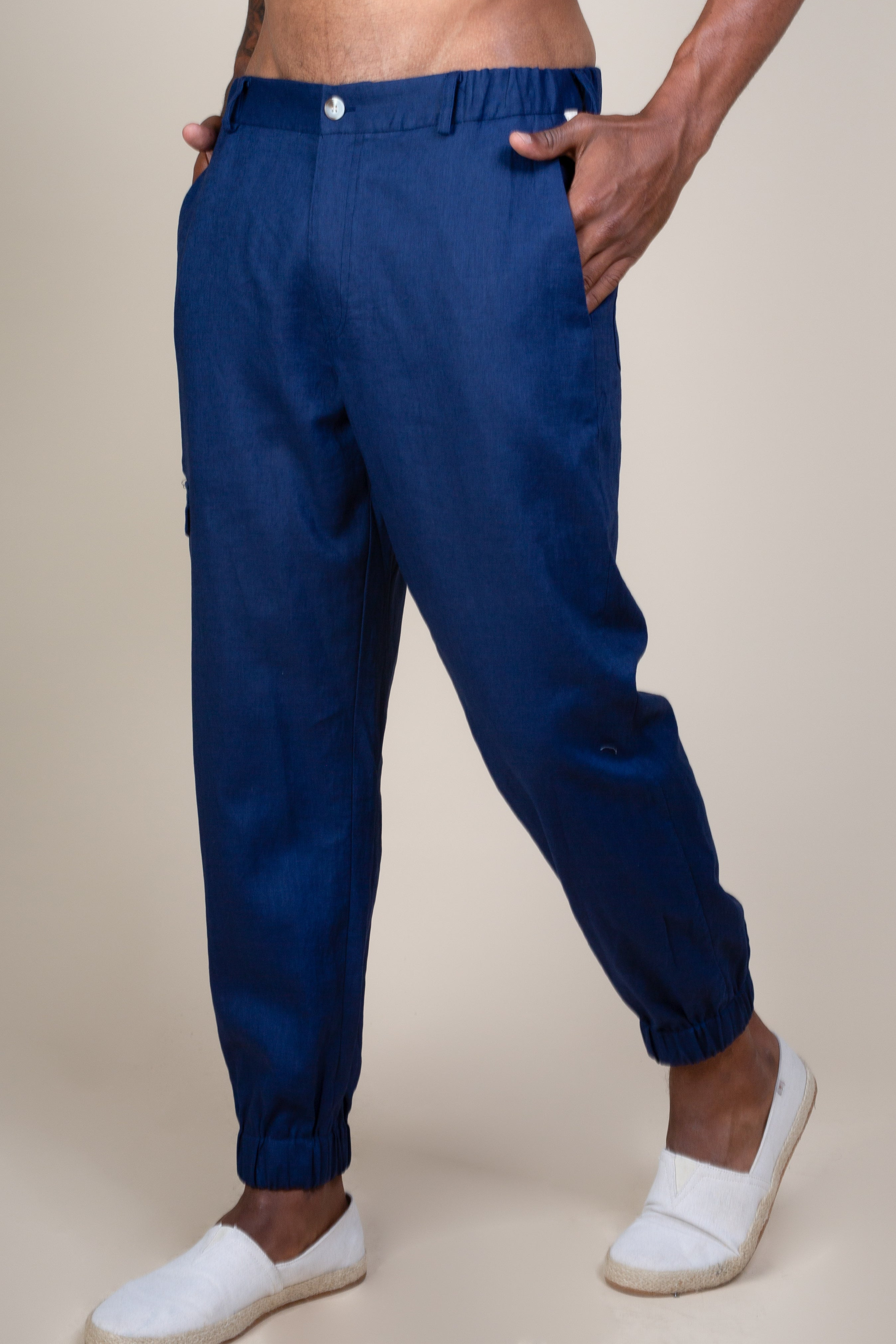 מכנס דגמ"ח באורך 7/8 מבד 100% פשתן עם כיס צד בצבע כחול