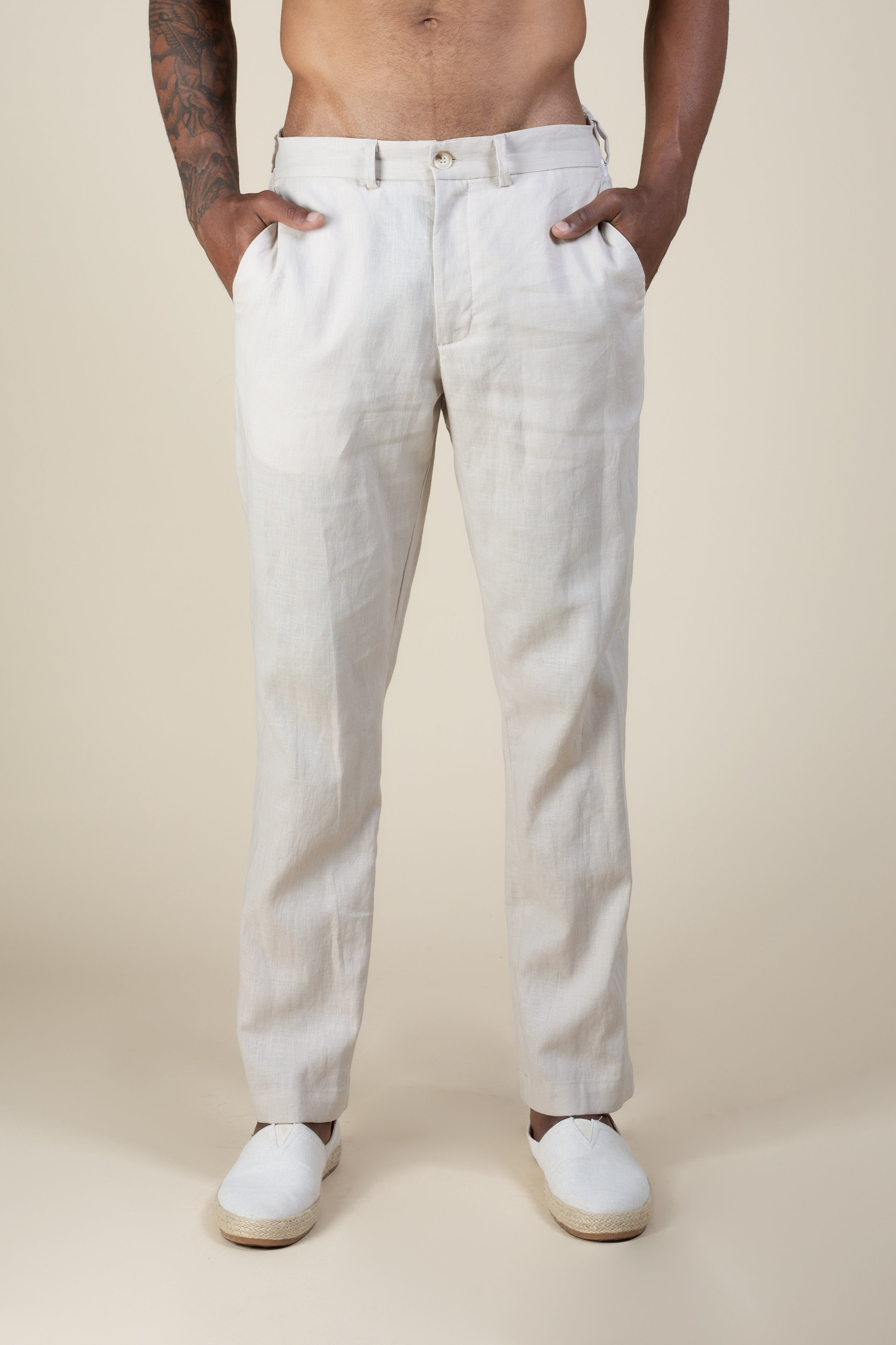 מכנס ארוך עם כיסי צד וכיס אחורי עם גומי בגב בגזרה קלאסית מ 100% פשתן שעבר תהליך שטיפה בצבע פשתן .